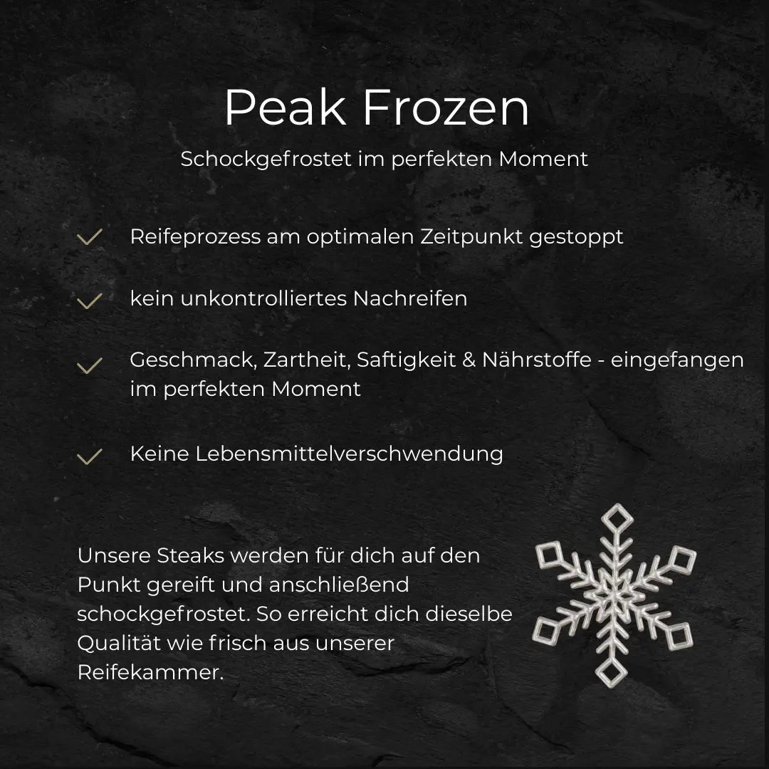 Wir bestimmen den perfekten Reifepunkt - nicht den Tag deiner Bestellung. Sobald Geschmack und Zartheit ihr Optimum erreicht haben, wird das Fleisch zugeschnitten, portioniert, verpackt und schockgefrostet.Wir frieren nicht einfach Fleisch ein - wir konservieren den Moment, in dem Geschmack und Zartheit ihr Optimum erreicht haben. So genießt du zuhause das Fleisch genau so, wie wir es in unserer Reifekammer erleben: auf den Punkt.