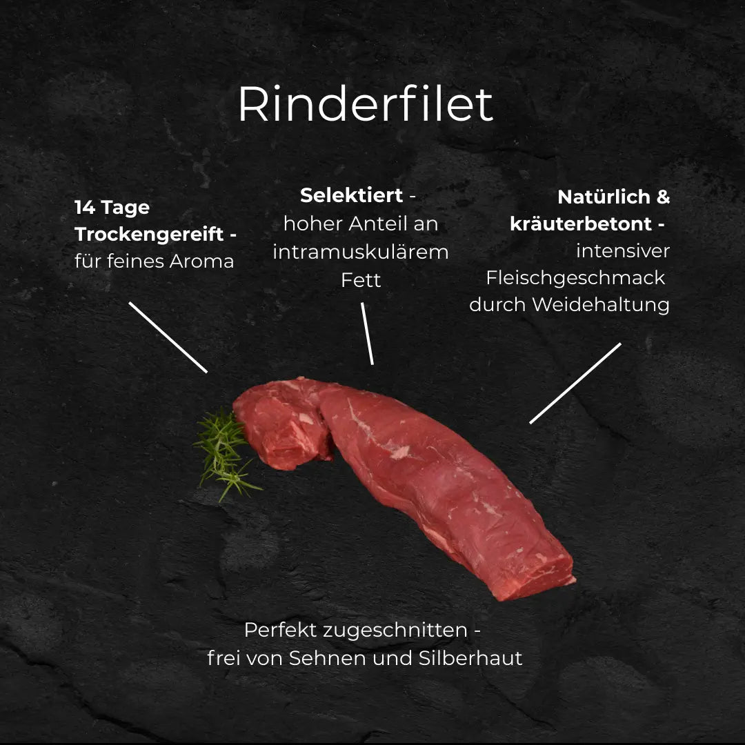 Das Rinderfilet überzeugt durch seine besonders feine Struktur und außergewöhnliche Zartheit. Die ausgewogene Reifung sorgt für sanfte Aromatik und klaren Fleischgeschmack. Ein Filet für alle, die feinen Fleischgenuss und elegante Zartheit schätzen.
